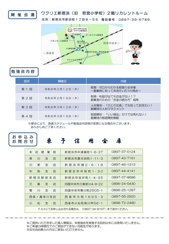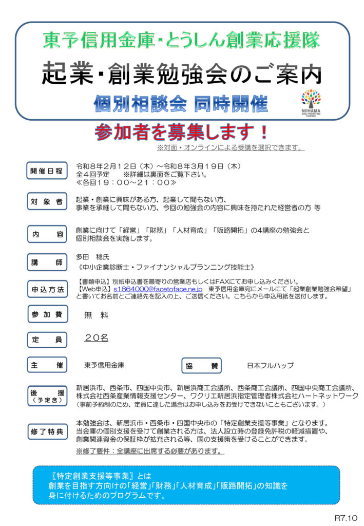 東予信用金庫・とうしん創業応援隊 起業・創業勉強会のご案内 個別相談会同時開催