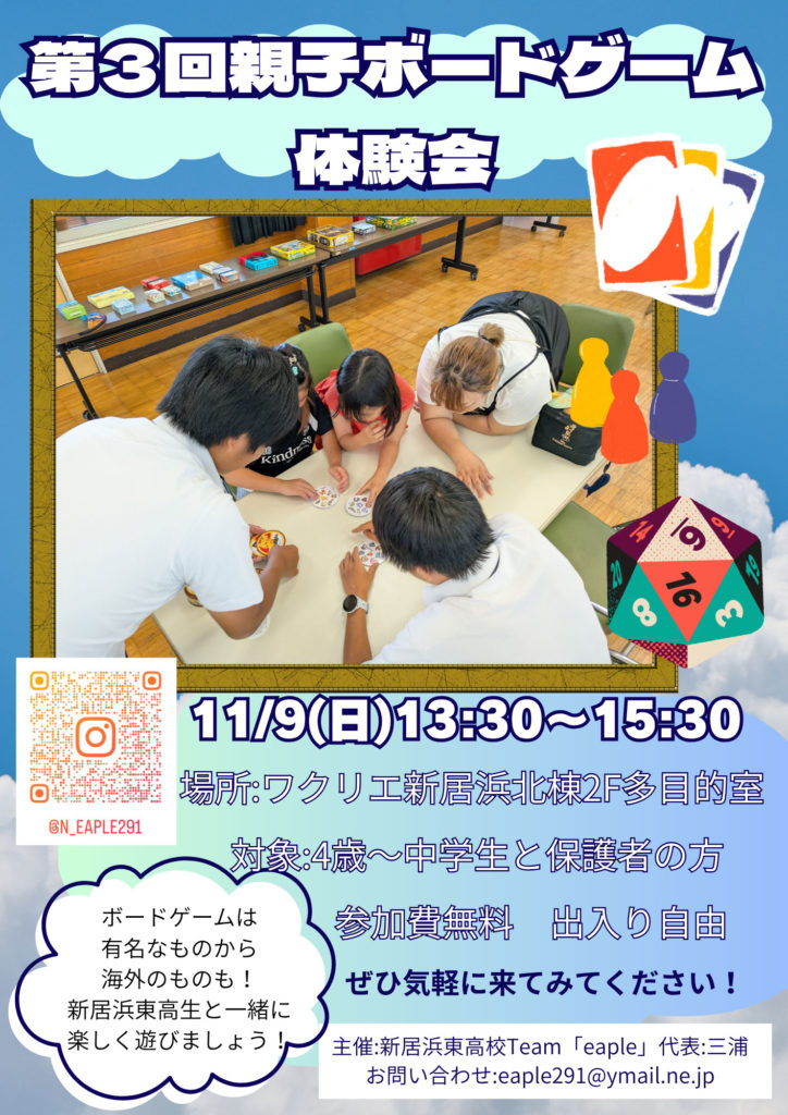 世界中のボードゲームを親子で体験してもらいます。新居浜東高校生がゲームの説明をしたり、一緒に遊んだりします。