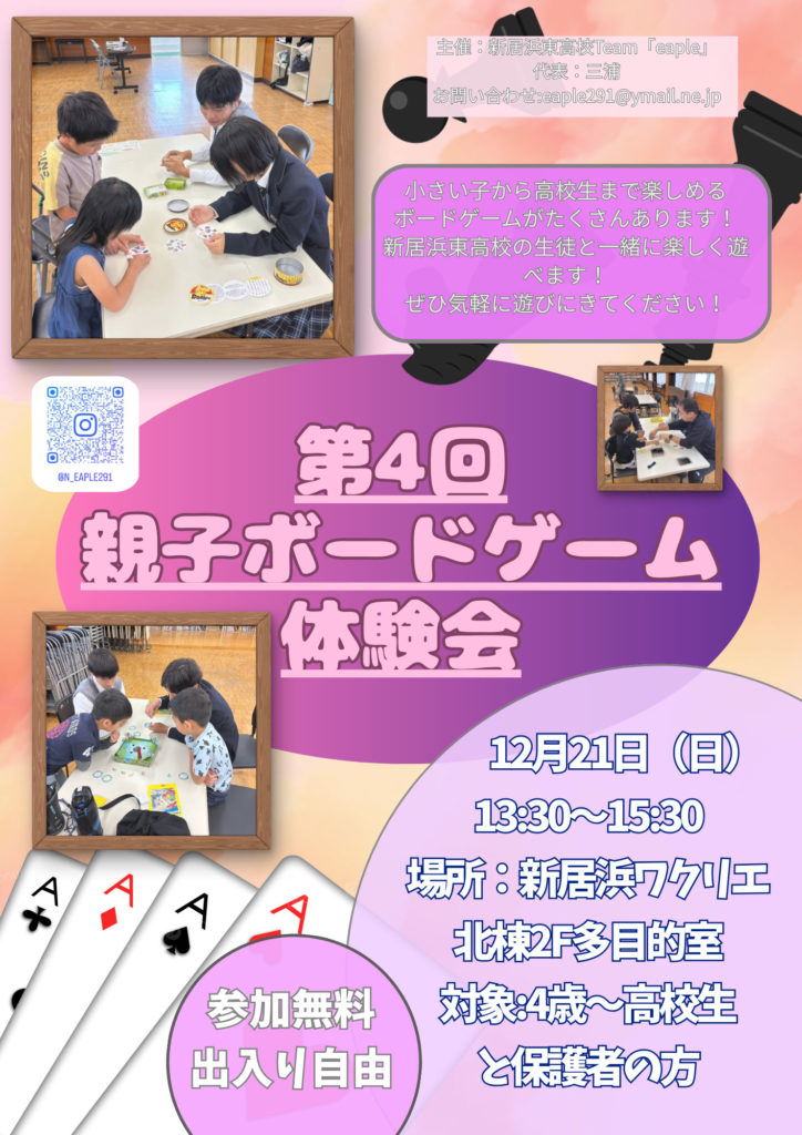 12月21日(日)に新居浜東高校Team「eaple」主催の第4回親子ボードゲーム体験会を開催します!いろいろなボードゲームを新居浜東高校生が説明したり、一緒に遊んだりします!ぜひ親子でご参加ください!参加費は無料で出入りも自由ですのでお気軽にご参加ください。