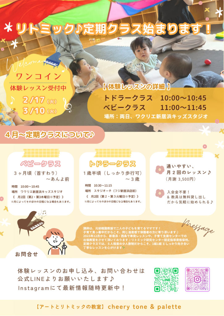 4月から始まる、リトミック定期クラスの体験レッスンを各クラス開催します♪(ベビー・トドラークラス)