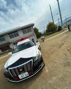 避難訓練の後には車両展示があり、ウニモグ・白バイ・パトカー・高機能救助車・トイレカーなど、普段は近くで見る事のない車両を見せてもらいました。